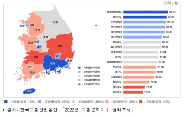 조사항목별로 살펴보면 운전행태가 48.65점으로 전국 17개 시·도에서 가장 높았으며, 보행행태는 17.50점으로 전국에서 두 번째로 높게 나타났으나, 교통안전 점수는 17.59점으로 전국에서 아홉 번째 순위로 미흡하게 나타났다.