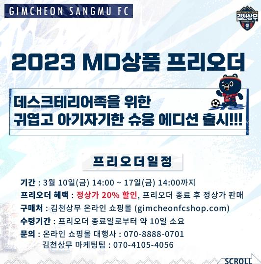 김천상무프로축구단이 10일 오후 2시부터 17일 오후 2시까지 구단 온라인 샵을 통해 새로운 MD를 판매를 시작한다. 출시 품목은 핸드폰 케이스를 비롯해 그립톡, 에어팟 케이스, 버즈케이스 등이다. 수령 가능일은 프리오더 종료일로부터 약 10일이다.
