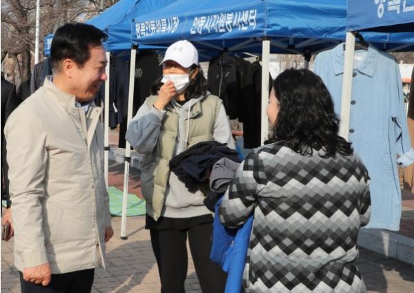 올해 첫 벼룩시장이 열린 지난 3월 11일, 봄을 맞아 온화한 날씨에 많은 시민들이 중고 물품을 사고팔며 거리에 모였다. 이날 권기창 안동시장은 현장을 찾아 자원봉사 관계자들을 격려하고 시민참여를 당부했다.