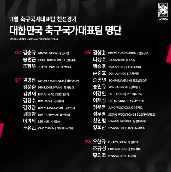 카타르 월드컵 대표팀 명단과 비교하면 두 명이 달라졌다. 윤종규(김천상무)와 홍철(대구FC)이 빠지는 대신 이기제(수원삼성)와 오현규(셀틱, 스코틀랜드)가 합류했다. 이기제와 오현규는 파울루 벤투 전임 감독 시절 대표팀에 뽑힌 바 있다.