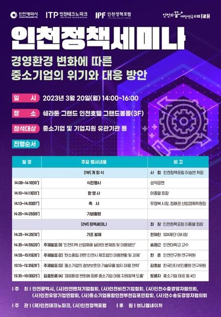 경영환경 변화에 따른 중소기업의 위기와 대응 방안을 다룰 ‘인천정책세미나’가 20일 오후 2시 송도국제도시 쉐라톤 그랜드 인천 호텔 3층 그랜드볼룸에서 열린다.