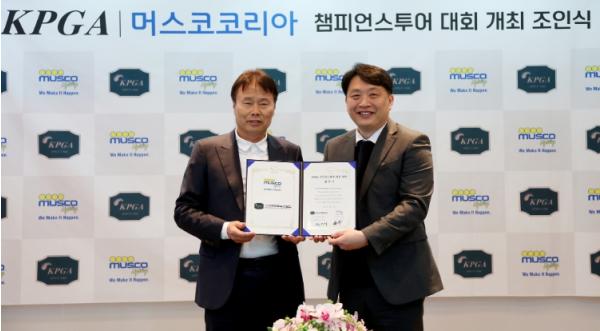13일 경기 성남시 소재 KPGA 빌딩 10층에서 진행된 조인식에는 머스코코리아 이대우 지사장과 KPGA 한연희 수석부회장 등 여러 관계자들이 참석해 성공적인 대회를 위한 협력을 약속했다.