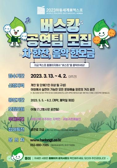 조직위는 신청서와 신청 시 제출한 공연 영상 등으로 서류·영상 심사를 거쳐 공연팀을 선발할 계획이며, 선정된 팀은 5월 엑스포 행사 기간 중 제1행사장(하동공설운동장) 또는 제2행사장(하동야생차박물관 일원)에서 버스킹 공연을 펼치게 된다.