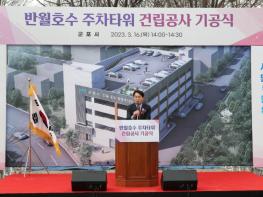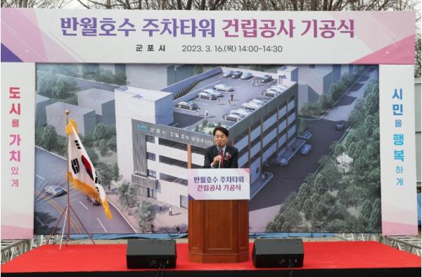 군포시는 3월 16일 둔대동 345-1번지(주차장 부지)에서 하은호 군포시장과 이길호 시의회의장, 이학영 국회의원, 도?시의원, 대야동 주민대표 등이 참석한 가운데 반월호수 주차타워 건립공사 기공식을 개최했다.