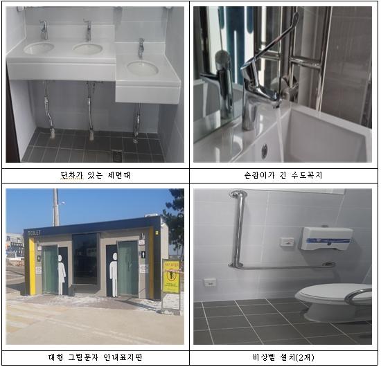 대형 그림문자 안내표지판을 설치해 누구나 공중화장실임을 빠르게 인식할 수 있도록 하고, 화장실 내부 배치 및 설비를 파악할 수 있는 촉지도식 안내표지판도 설치한다. 또한 화장실 내부에는 높이가 다른 세면대와 손잡이가 긴 수전을 설치해 누구나 접근 및 사용이 가능토록 한다.