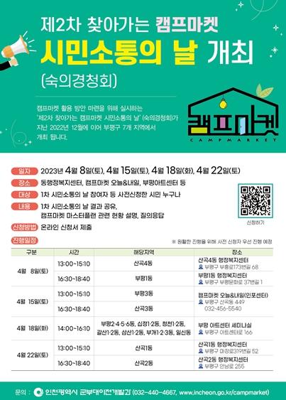 인천광역시는 캠프마켓 공원조성에 대한 시민들의 생생한 의견을 듣고자‘제2차 찾아가는 캠프마켓 시민소통의 날'을 부평구 7개 지역에서 개최한다고 밝혔다.