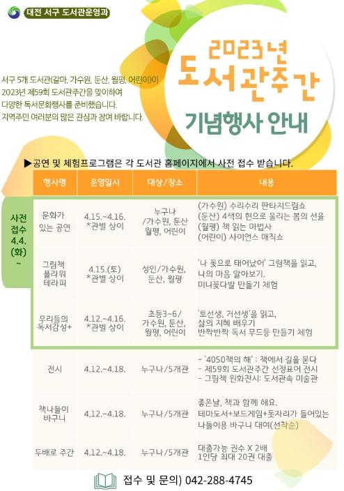 대전 서구는 5개 도서관(갈마·가수원·둔산·월평·어린이)에서 제59회 도서관주간을 맞아 구민들을 위해 다채로운 독서문화 프로그램을 운영한다고 23일 밝혔다.