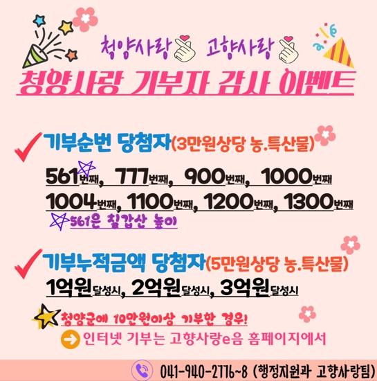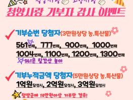 김돈곤 군수는 “청양사랑 기부자 감사 이벤트로 우리 군을 응원해 주신 분들에게 감사를 표하면서 청양을 더 많이 알리는 계기로 삼겠다”라고 말했다.