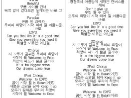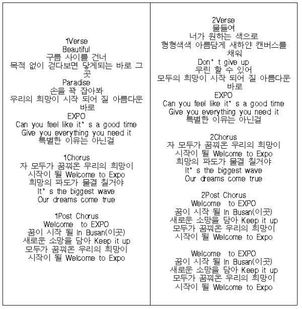 이날 공개한 엑스포 응원송은 해외에서 최근 활발하게 활동하고 있는 작곡가 그룹과 NCT, 보아 등 유명 아이돌과 함께 작업했던 프로듀서 숀 킴(Shaun Kim)이 프로듀싱과 작사를 맡았고, 노래 ‘신호등’으로 대중적인 인기를 얻고 있는 가수 이무진이 노래했다.
