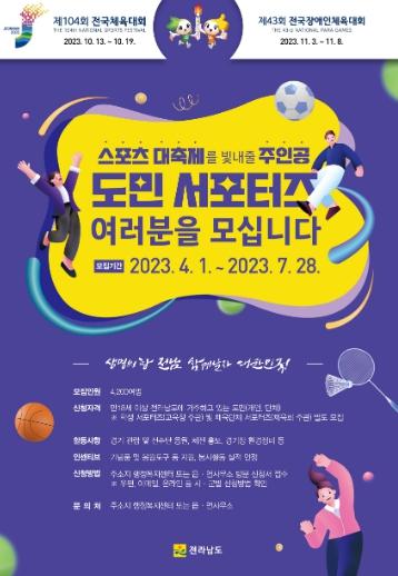 전라남도는 10월과 11월 개최하는 제104회 전국체전과 제43회 전국장애인체전을 도민이 함께 즐기는 화합과 감동체전으로 만들기 위해 함께 뛸 도민 응원단을 모집한다고 밝혔다.