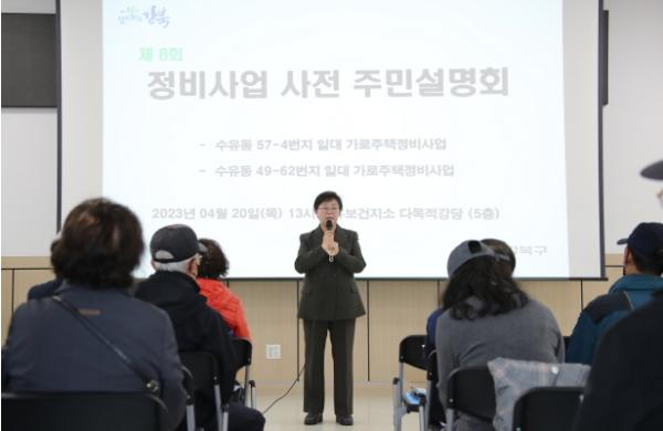 이순희 서울 강북구청장(가운데)이 지난 20일 수유보건지소에서 열린 ‘제8회 알기쉬운 정비사업 사전주민설명회’에 참석했다. 이날 설명회는 가로주택정비사업 대상지로 선정된 수유동 57-4, 49-62 일대 주민을 위해 열렸다.