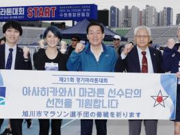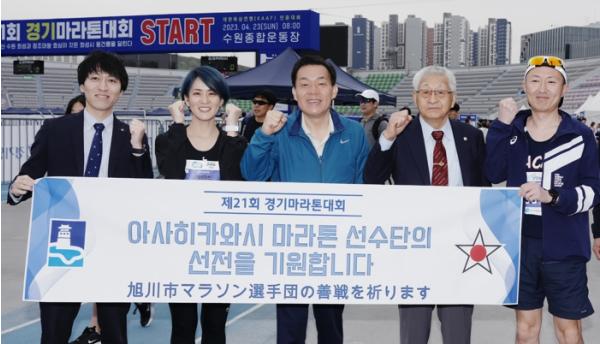 수원시의 국제자매도시인 일본 아사히카와시의 마라톤교류단이 수원시를 방문해 23일 열린 ‘제21회 경기마라톤대회’에 참가했다.