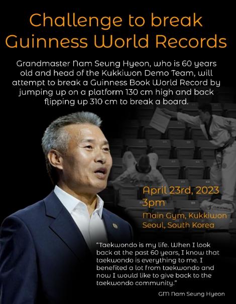 이동섭 국기원장은 “남단장의 꾸준한 수련과 노력은 전 태권도인들의 귀감이 되고도 남는다”면서 “기네스 기록 도전과 성공을 축하한다”고 말했다.