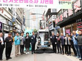 용인특례시가 작은 골목길도 청소하기 위해 도입한 친환경 전기노면소형 청소차 제막식과 시연회를 24일 용인중앙시장에서 열었다.