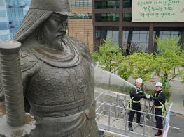 아산시가 25일 서울 광화문광장에서 충무공 이순신 장군 탄신 제478주년을 기념하는 이순신 장군 동상 친수식을 거행했다.