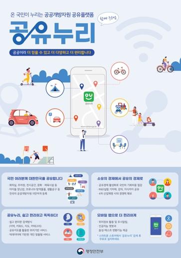 공유누리 서비스는 행정안전부에서 구축하여 운영하는 통합플랫폼으로 행정기관이 보유한 시설, 물품 등 공공개방자원을 유휴시간에 개방하여 전 국민이 편리하게 이용할 수 있도록 만든 공공개방자원 공유서비스 포털이다.