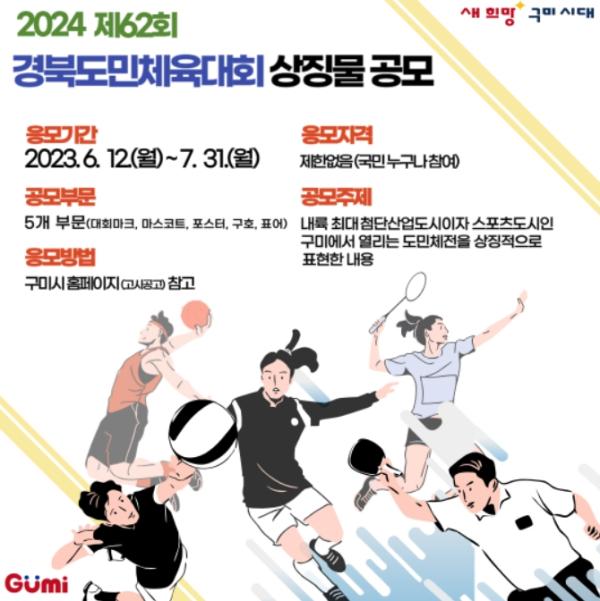 구미시는 2024년 개최하는‘제62회 경북도민체육대회’의 대회마크(엠블럼), 마스코트, 포스터, 구호, 표어 등 5개 부분의 상징물 공모 기간을 기존 12일에서 이달 31일까지로 연장한다.