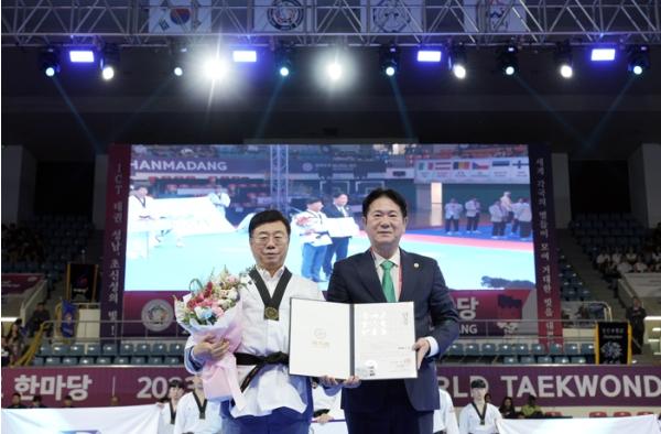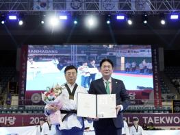 신 시장은 환영사 전 이동섭 국기원장으로부터 태권도 명예 7단 단증을 수여받았다.