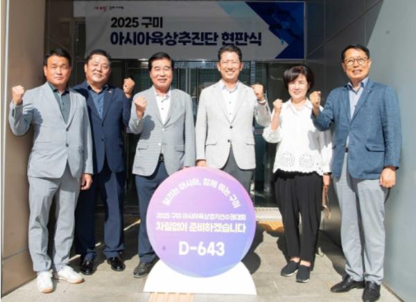 구미시는 23일 시 체육회관에서 김장호 시장, 안주찬 시의회 의장, 윤상훈 시 체육회장 등 20명이 참석한 가운데 '아시아육상추진단 현판식'을 갖고 본격적인 대회 준비에 나섰다.