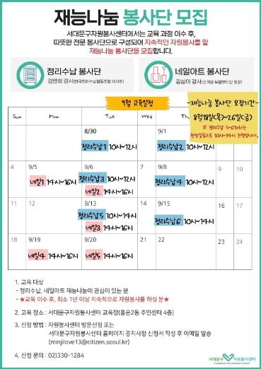 서대문구자원봉사센터 교육장(홍은2동주민센터 4층)에서 정리수납은 6회, 네일아트는 5회씩 교육이 이뤄진다. 정리수납은 현장 실습 2회가 포함된다.