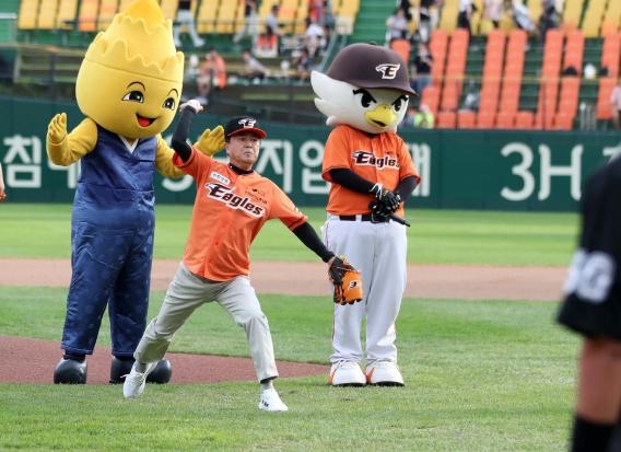김 지사 시구에 대한 시타는 대백제전 마스코트 ‘금이’가 진행했다.