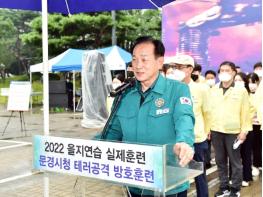 [스포츠와 엔터테인먼트의 만남 '스포테이너즈(SPORTAINERS)', 고초록기자] 문경시는 8월 23일 오후 4시부터 문경시청 전정에서 문경시청 테러대응 방호훈련을 주제로 2022 을지연습 실제훈련을 실시했다. 이번 실제훈련은 테러로 인한 붕괴, 화재 등 불시에 닥칠 수 있는 전·평시 재난상황에 따른 인적·물적 피해를 최소화하고 민·관·군·경 신속한 초동조치를 통해 사태수습 능력을 배양하기 위해 마련됐다.