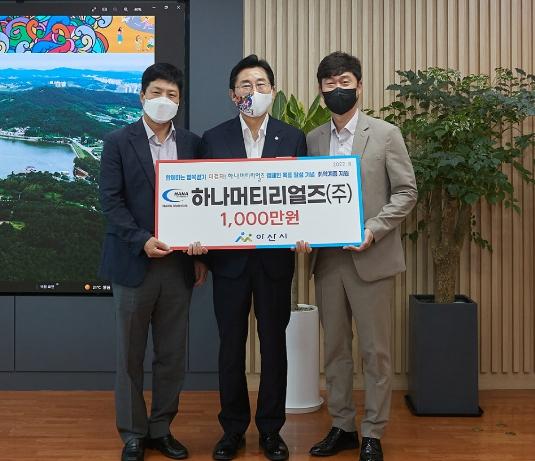 하나머티리얼즈(주)가 걷기 캠페인 목표 달성을 기념해 지난 26일 아산시에 취약계층 지원을 위한 성금 1000만원을 기부했다.