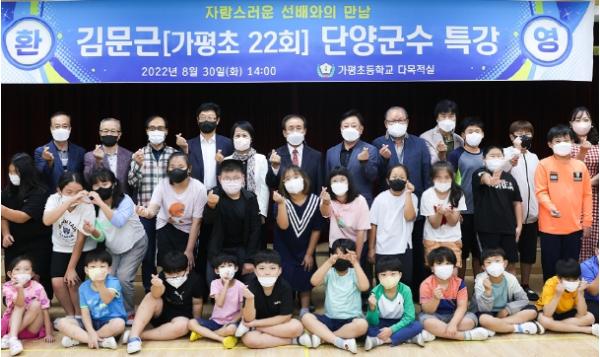 [스포츠와 엔터테인먼트의 만남 '스포테이너즈(SPORTAINERS)', 고초록기자] 김문근 단양군수는 지난 30일 화요일 모교인 매포읍 가평초등학교를 방문해 전교생을 대상으로 열정과 정성에 관해 특강을 진행했다.