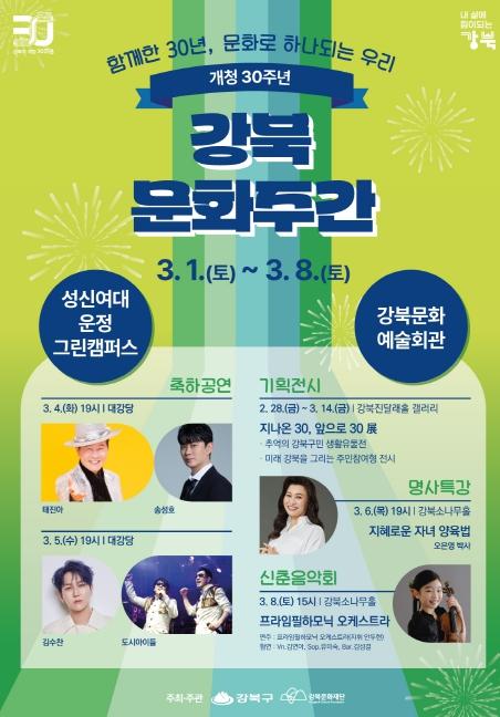 서울 강북구는 개청 30주년을 기념하여 오는 3월 1일(토)부터 8일(토)까지 '강북 문화주간'을 운영한다고 밝혔다.