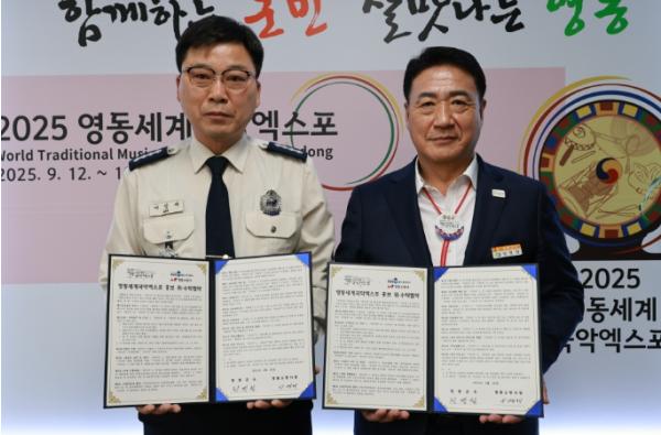 이명제 서장은 “국악은 영동군의 중요한 관광자원이며, 엑스포의 성공 개최를 위해 최선을 다하겠다”며 “이번 협약이 양 기관 간의 모범적인 협업 사례로 남길 바란다”고 밝혔다.