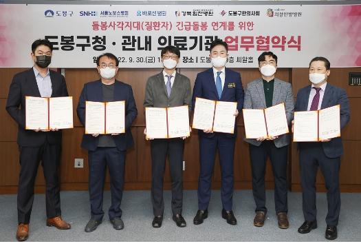 [스포츠와 엔터테인먼트의 만남 '스포테이너즈(SPORTAINERS)', 고초록기자] 도봉구가 귀가 후 돌봄위기상황에 놓일 수 있는 환자의 긴급돌봄 연계를 위해 2022년 9월 30일 구청 씨알홀에서 서울노보스병원, 바로선병원, 강북힘찬병원, 의성한방병원, 도봉구한의사회와 업무협약을 체결했다.