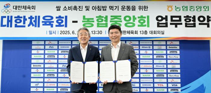[스포테이너즈=고초록 기자] 대한체육회(회장 유승민)는 6월 10일(화) 오후 1시 30분, 서울 송파구 올림픽회관 13층 대회의실에서 농협중앙회(회장 강호동)와 함께 ‘아침밥 먹기 운동 업무협약’을 체결했다. 이번 협약은 쌀 소비 촉진과 체육인의 건강한 식습관 형성을 목적으로 마련됐다.