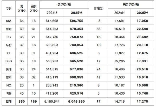 17일까지 평균 관중은 1만 7,275명으로 2024시즌 동일 경기 수에서 기록한 평균 관중 수 1만 4,716명 대비 약 17% 증가했다. 구단 별로는 삼성이 평균 관중 2만 2,548명으로 1위를 기록 중이다. 이어서 LG가 2만 1,682명, 롯데 2만 516명, 두산이 2만 110명으로 4개 구단이 2만명이 넘는 평균 관중을 기록하고 있다. SSG(1만 7,931명), KIA(1만 7,050명), 한화(1만 6,916명)까지 7개 구단이 1만 6,000명이 넘는 평균 관중을 기록하고 있으며, 10개 구단 모두 평균 1만명 이상의 평균 관중을 기록하고 있다.