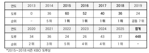 현역 선수 중 최다 도루 기록 보유자인 LG 박해민이 KBO 리그 역대 5번째 450도루 달성을 앞두고 있다.