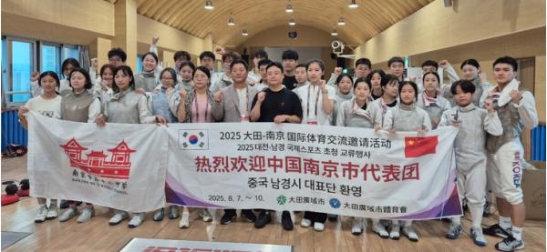 대전시와 자매도시 중국 난징시가 ‘2025 대전-난징 국제 스포츠 초청 교류대회’를 통해 스포츠와 문화 교류에 한창이다. 7일 입국한 난징시 제12고등학교 펜싱선수단 15명은 8일에서 9일까지 대전생활과학고 펜싱장에서 양 도시 고등학생 선수들과 합동훈련과 친선경기를 이어가며 우정을 쌓는다.