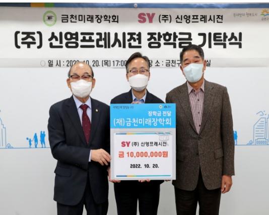 신창석 (주)신영프레시젼 회장은 “청년들과 신혼부부를 위한 청년미래주택건설에 이어, 금천구 청소년들을 위한 장학사업에도 도움을 줄 수 있게 돼 기쁘게 생각한다”라고 말했다.