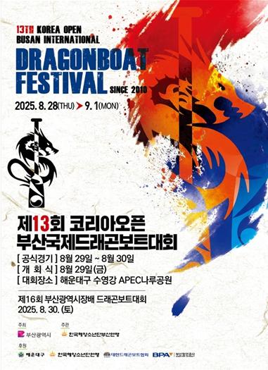 부산시는 오늘(28일)부터 9월 1일까지 5일간 수영강 에이펙(APEC) 나루공원 일원에서 '제13회 코리아오픈 부산국제드래곤보트대회 및 제16회 부산광역시장배 드래곤보트대회'를 개최한다고 밝혔다.