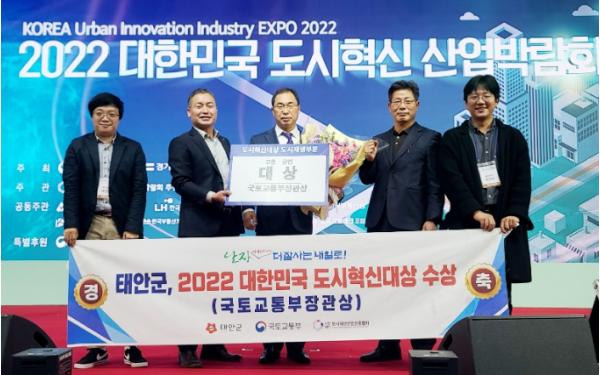군은 태안지역 도시재생전략 계획을 기반으로 태안의 문화·생태·산업 등이 어우러진 지역 발전을 이끈 성과를 인정받아 도시재생 부문 고용·창업 분야 전국 1위 기관으로 선정, 지난 25일 경기도 용인시 종합운동장에서 열린 ‘2022 대한민국 도시혁신 산업박람회’에서 국토부장관상을 수상했다고 밝혔다.