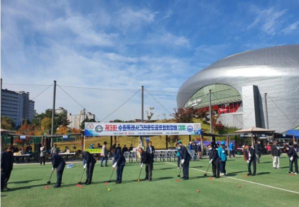 [스포츠와 엔터테인먼트의 만남 '스포테이너즈(SPORTAINERS)', 고초록기자] 수원시 권선구는 10월 26일 수원시 그라운드골프협회는 서수원 칠보체육관 잔디구장에서 내빈과 선수단 200여명이 참여한 가운데 『제3회 수원특례시협회장배 그라운드골프대회』를 개최했다고 밝혔다.