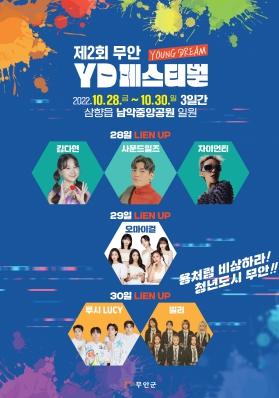 코로나19로 인해 3년만에 개최하는 무안 YD 페스티벌은‘용처럼 비상하라! 청년도시 무안!!’이라는 주제로 전남도 17개 군(郡)중에서 청년(19~45세)인구가 가장 많은 무안의 특성을 살려 청년층을 중심으로 주민이 함께 어우러져 즐기며 지역사회의 화합을 도모하고자 마련됐다.