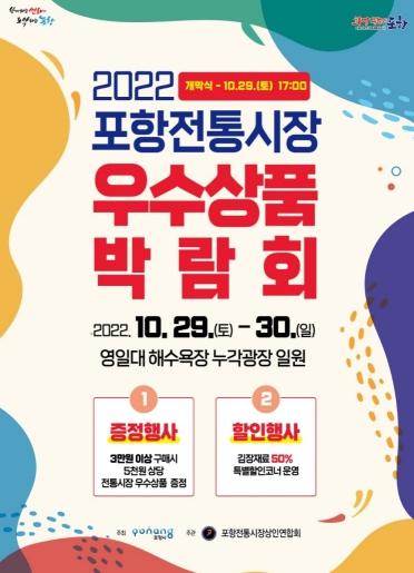 올해로 2회를 맞는 ‘포항시 전통시장 우수상품 박람회’는 지역 내 전통시장 상인들간 우수사례를 공유하고 시장별 특화상품을 판매하는 등 전통시장 활성화를 목적으로 열리는 포항시 전통시장 대표 축제로, 2019년 개최 후 코로나19 장기화로 중단됐다가 3년 만에 개최하게 됐다.