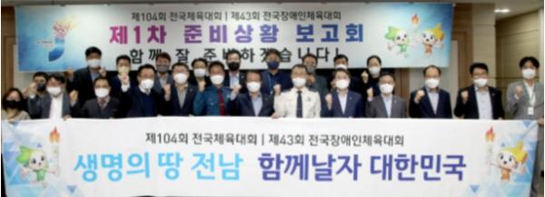 [스포츠와 엔터테인먼트의 만남 '스포테이너즈(SPORTAINERS)', 고초록기자] 전라남도는 26일 도청 서재필실에서 2023년 ‘제104회 전국체전’과 ‘제43회 전국장애인체전’을 앞두고 제1차 준비상황보고회를 열어 소통과 협력체계 구축을 통한 성공 개최 결의를 다졌다.