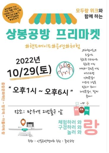 이번 프리마켓은 상봉공방협의체를 비롯한 지역 내 공방 작가 30여 명이 주축이 돼 준비한 다채로운 핸드메이드 제품 판매와 공방 체험 프로그램, 중랑아티스트의 공연으로 이루어진다.