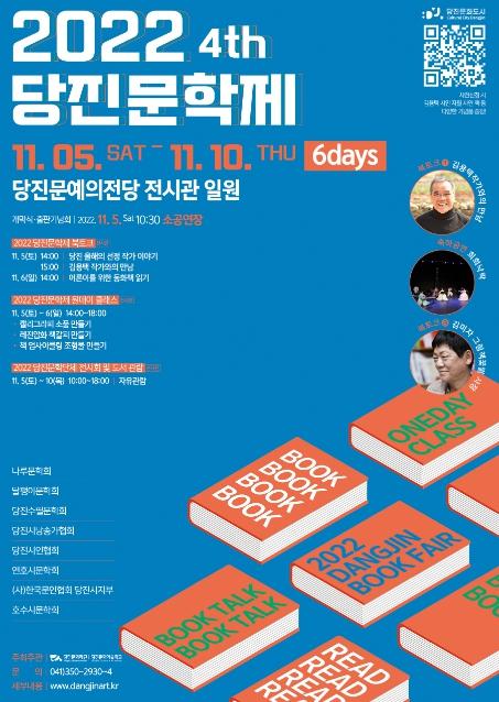 5일(토) 오전 10시 30분에 당진문예의전당 소공연장에서 문학인 출판사업에 선정된 박옥매(이 시대의 문학인), 박은주?이금자?정숙자(올해의 문학인), 박영양?성경옥(신진 문학인) 작가들의 출판기념회와 함께 당진 문학제 개막식이 함께 진행될 예정이다.