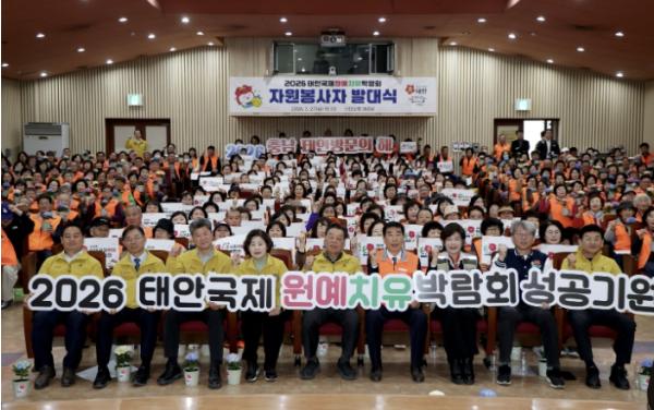 태안군이 지난 27일 ‘2026 태안국제원예치유박람회’ 개최까지 29일을 남겨놓고 군청 대강당에서 개인 및 단체 봉사자 350여 명이 참석해 군민자원봉사단 발대식을 개최하고 박람회의 성공적인 개최를 위한 조직 결속 강화에 나섰다.