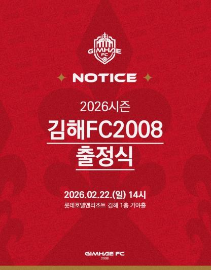 • K리그2 무대에 첫 도전장을 내미는 김해FC2008(이하 김해FC)이 오는 22일 오후 2시, 롯데호텔앤리조트 김해에서 ‘2026시즌 출정식’을 개최한다.
