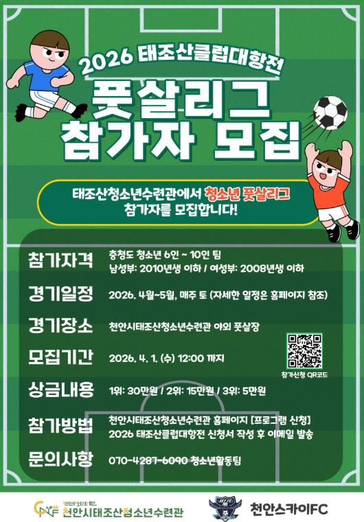 • 천안시청소년재단 산하 천안시태조산청소년수련관은 청소년의 건강한 여가 활동과 스포츠 참여 기회를 확대하기 위해 ‘2026 태조산 클럽대항전 풋살리그’ 참가팀을 모집한다고 20일 밝혔다.