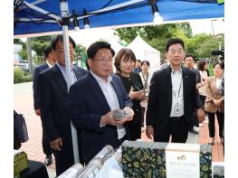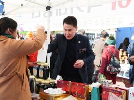 오언석 도봉구청장이 지난 1월 31일 도봉구청 전면광장에서 열린 ‘설맞이 농축수산물 직거래장터’를 찾아 지역특산물을 구매하고 상인들과 인사를 나눴다.이날 장터에서는 도봉구 우호교류 도시인 원주시,