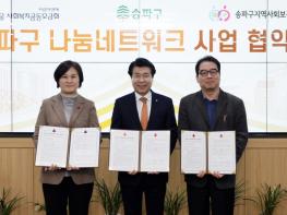 송파구는 19일 서울 사회복지공동모금회, 송파구지역사회보장협의체와 업무협약을 체결하고, '2024년 송파구 사랑의 열매 나눔네트워크 사업'을 추진한다고 밝혔다. 사랑의 열매 나눔네트워크 사업은 지역