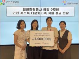인천관광공사가 인천지역 저소득 다문화가정을 위한 기부금 400만원을 인천중구가족센터에 전달했다. 이번 기부는 공사 창립 9주년 맞이 사회공헌 활동의 일환으로, 특히 공사가 지난 4월 사옥을 중구 소재